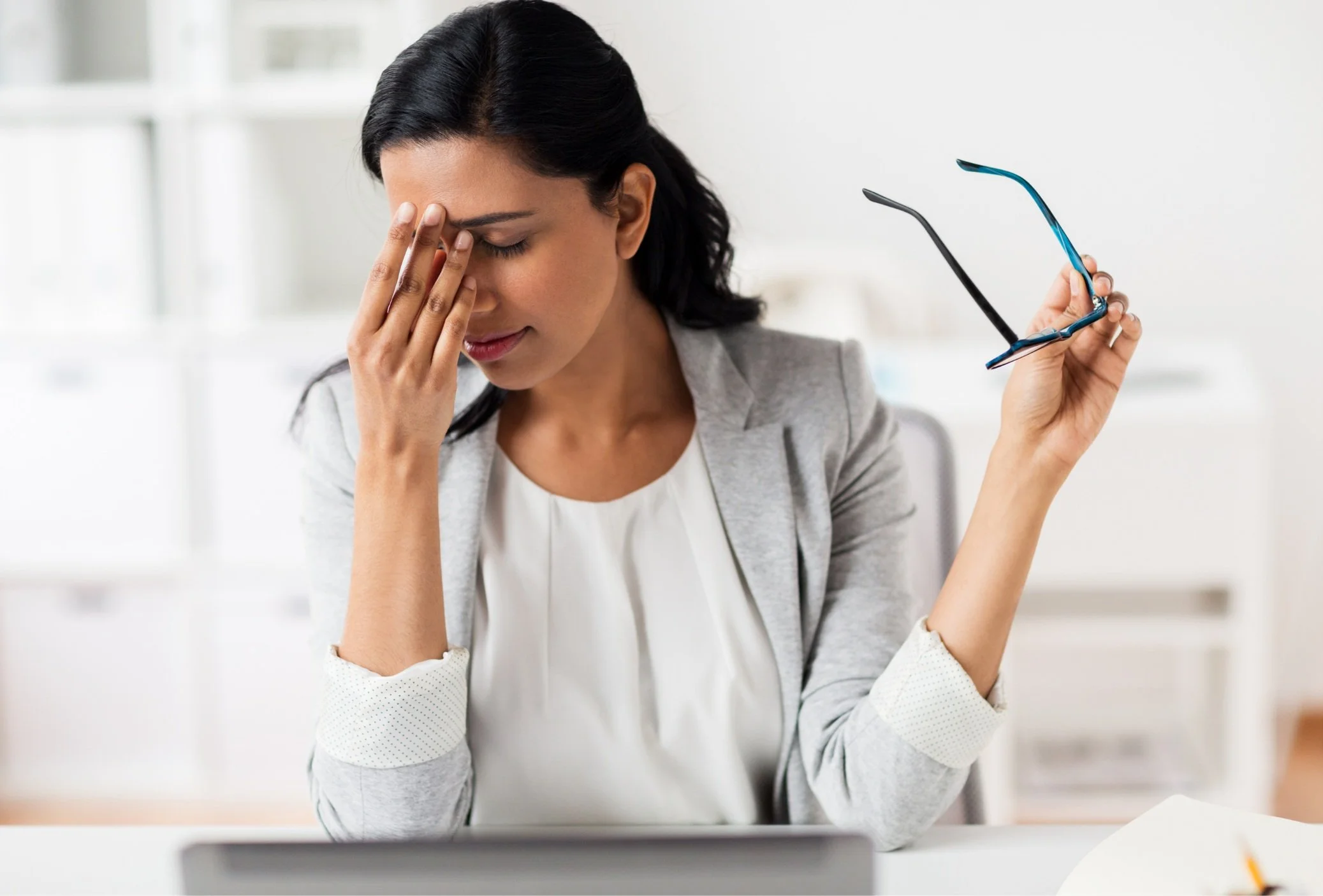 Feels like: dull, nagging pressure worsened by sitting at a desk or looking down at screens